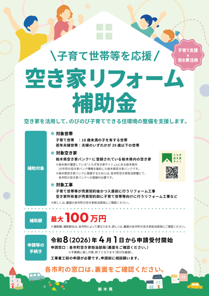 子育て世帯等を応援する「空き家リフォーム補助金」の申請受付を令和8(2026)年4 月1 日から開始します。